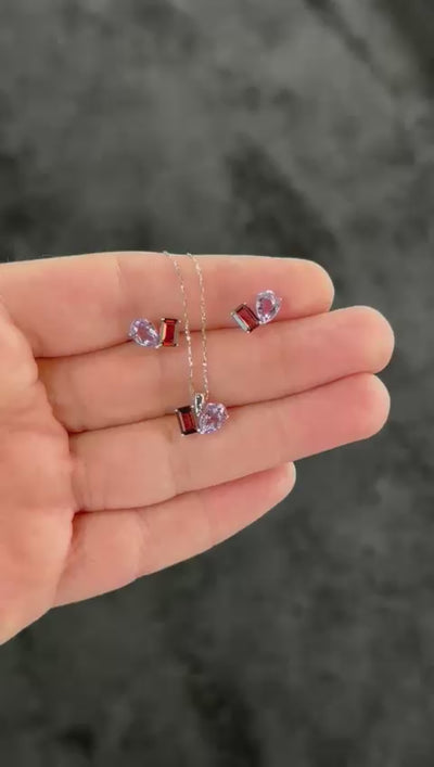Aretes de Oro Blanco 14K con Garnet y amatista
